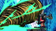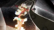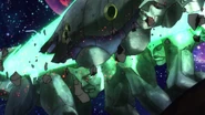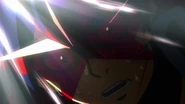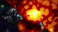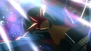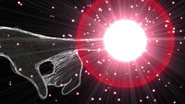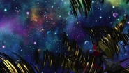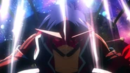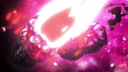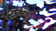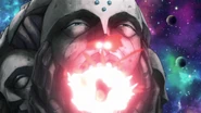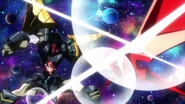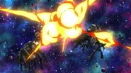 In bringing out the Super Galaxy Gurren Lagann, Simon grabs the main face of the enemy ship and digs into it, creating a large explosion. The other battleship then starts bombarding them with planets, but Simon responds with the Gurren Boomerang which rips through the enemy. The Anti-Spirals answer right back with a barrage of missiles that manage to hit the Super Galaxy Gurren Lagann through its spiral field because the enemy shells are of the probability variation type. According to Lord Genome, this type of attack neutralizes the probability of them defending against it, causing Darry to point out that controlling probability is in god’s domain. When a bright light then appears in front of them, it is accompanied by the Anti-Spiral voice questioning if they’re going to move ahead at the expense of their comrades. The voice claims that the spiral power which only thinks about evolving will conclude in the destruction of the entire universe and explains that it’s the power that connects life and the infinite power of the universe. The growth of the mega galaxy is proportional to the growth of life, and developing forms to gain more spiral power is evolution. However, this power is uncontrollable, and it will lead to a black hole that will return the entire universe to nothingness - this is the Spiral Nemesis.