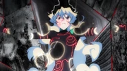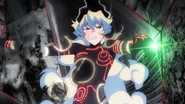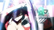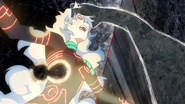 Unaware of what’s going on, the black Anti-Spiral is currently interrogating Nia about why she opposes them to that extent. Nia believes that Simon will definitely come, but the Anti-Spiral places his hand on her head and causes her a great deal of pain as he drains her. In the middle of this, however, Nia notices her ring pulsating light. She struggles to point it forward, and the pulsating changes to a constant light from which the Gurren Lagann soon emerges. Inside the Gurren Lagann is Simon who has come to save her.